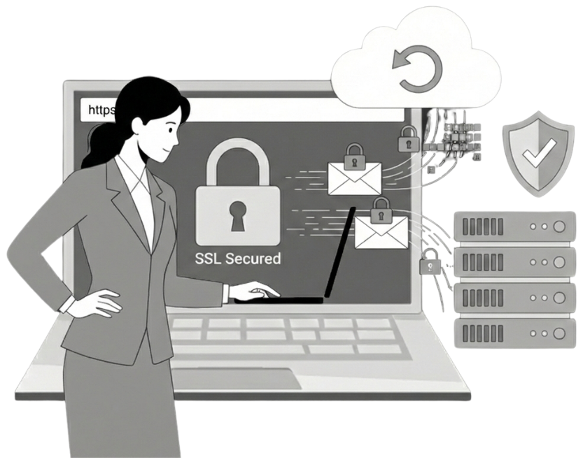 当サービスで構築するECサイト・ホームページは、すべて SSL(暗号化通信)に対応しています。 お問い合わせ内容や注文情報などのデータは暗号化され、 第三者に内容を読み取られる心配がありません。