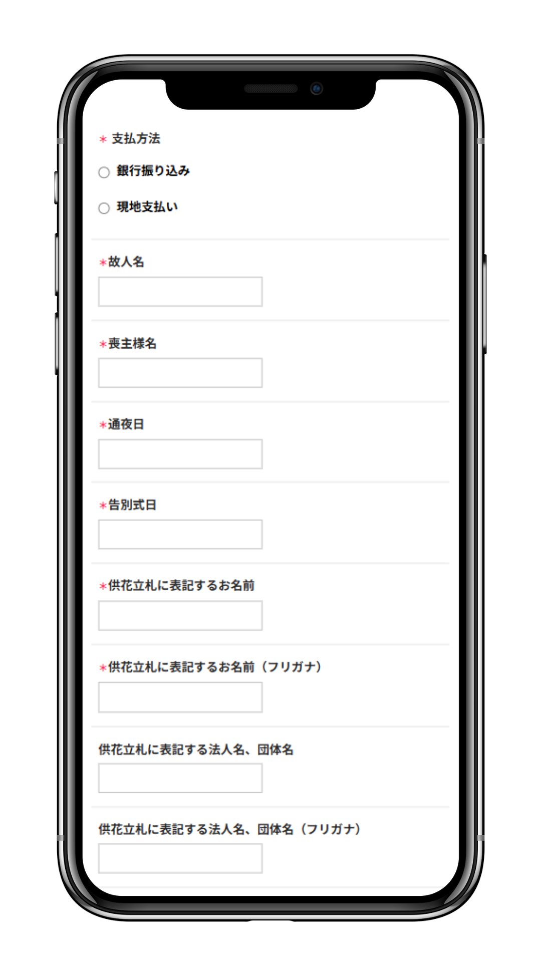 供花・供物のご注文に必要な情報(故人様のお名前、通夜・告別式の日時、立札の表記内容など)をフォーム上でお客様に入力していただきます。これにより、電話やFAXでありがちな聞き間違いや伝達ミスを防ぎます。